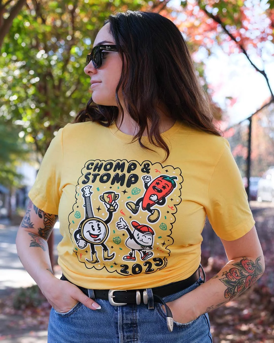 Two years in a row, I’ve had the distinct honor of designing the merch for the Chomp and Stomp festival! I kept a similar style to last year - new cartoon characters and a retro feel. I also designed the poster for the event, check that out here.